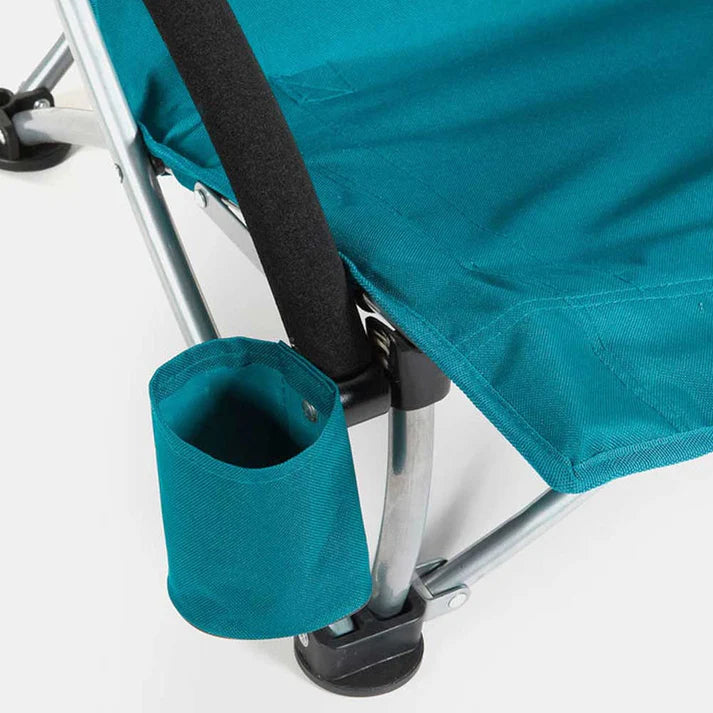 - Enjoy long hours of leisure with this low-profile beach chair with optional umbrella attachment, padded armrests and cupholder.No Assembly required